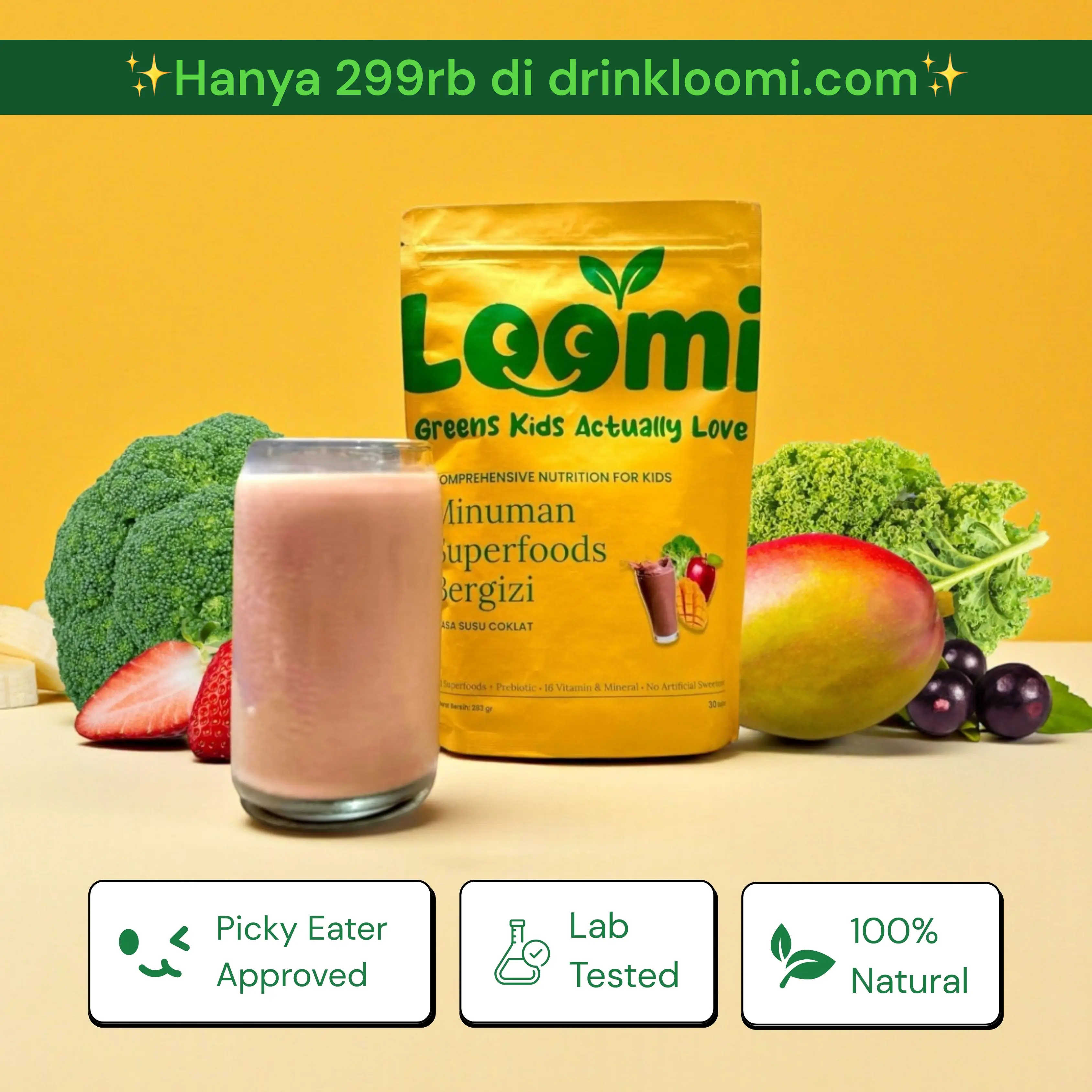 Summary: Anak kira Loomi cuma susu coklat favorit mereka… padahal isinya 40+ sayur & buah superfoods, serat prebiotik, vitamin dan mineral yang bantu imun, pencernaan, dan perkembangan optimal.